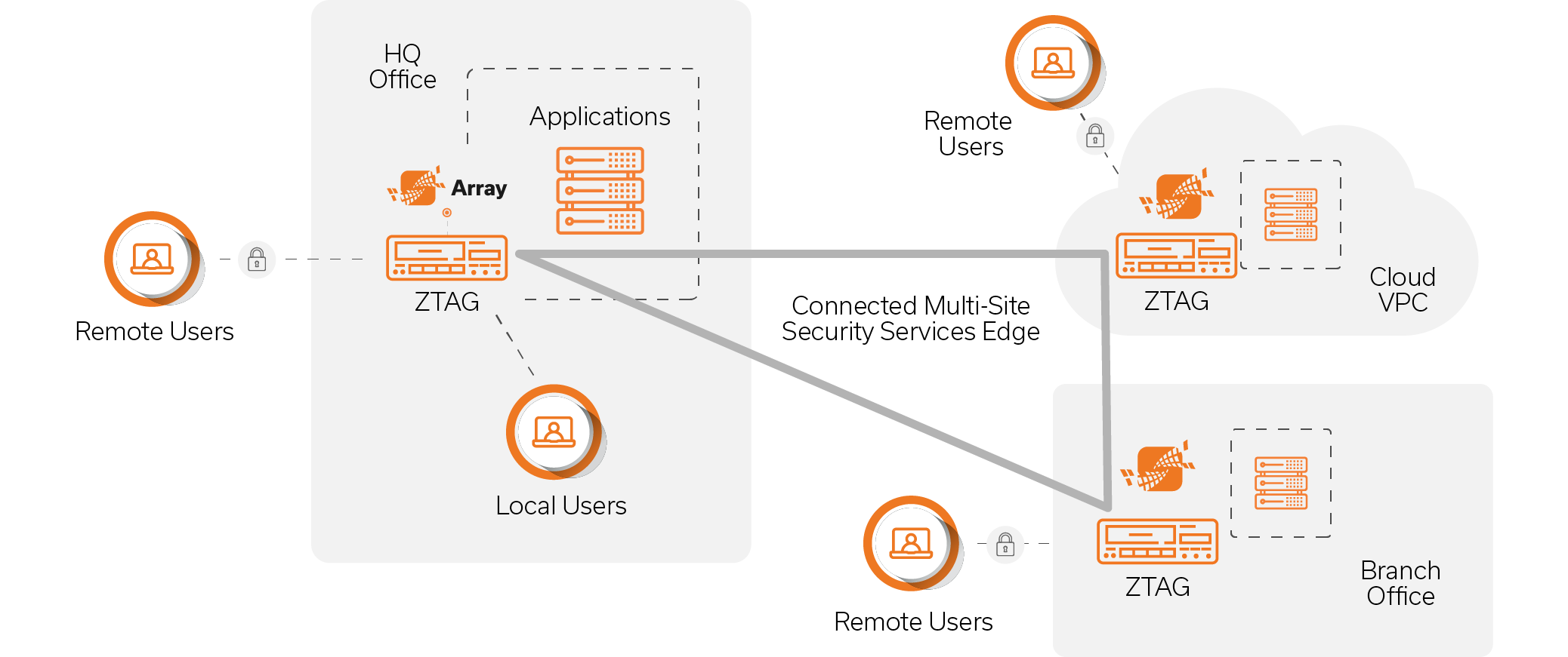 True zero trust means holding all users to the same standards, whether local or remote. Front-ending business-critical apps with Array’s ZTAG, enterprises can enforce strong user authentication, device validation, granular access control, and app-level connectivity for all users anytime, anywhere.
